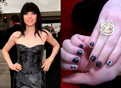 Como disse, Carly Rae Jepsen aprovou o estilo filha única, mas diferenciando das outras, preferiu usar um esmalte preto com glitter, e nas diferentes, um esmalte branco com aplicações.